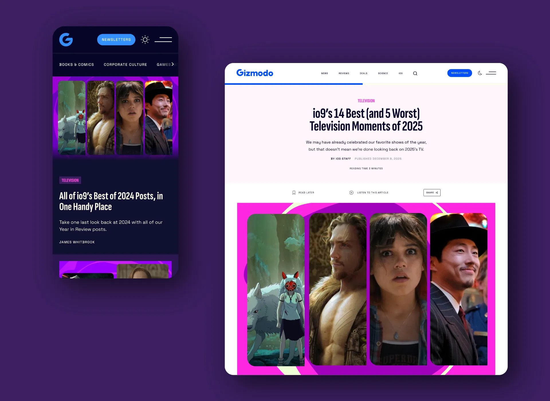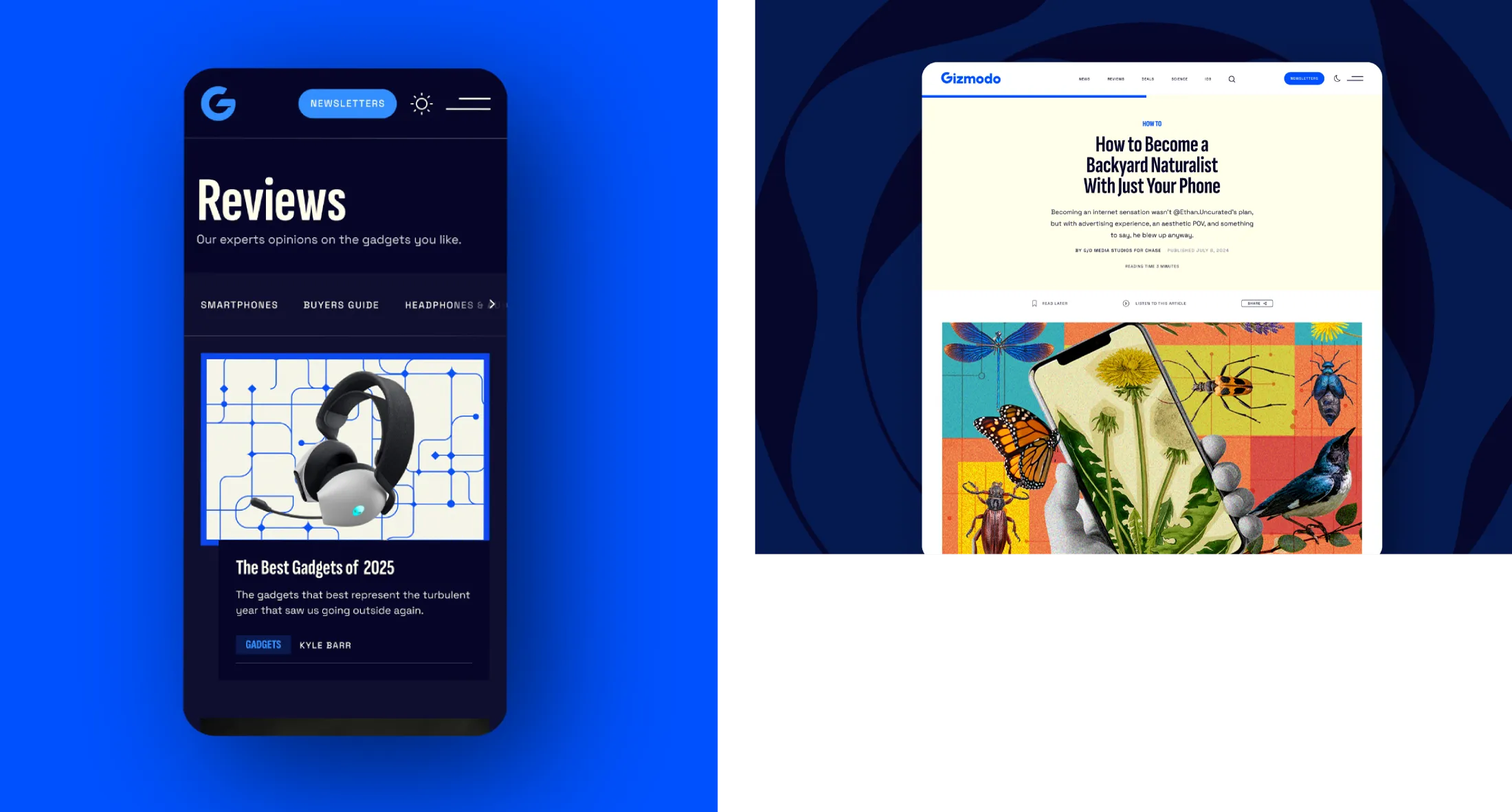 We reimagined Gizmodo’s digital presence with a refreshed visual identity and modern UI that honors the brand’s legacy while looking ahead. The redesign introduced a playful, tech-inspired visual world—balancing bold typography, vibrant accents, and intuitive layouts to create an engaging reader experience. Alongside Gizmodo, we also revamped io9 and Earther, extending the design system into a sister brand universe that feels distinct yet connected. The result is a cohesive, modern platform that speaks to Gizmodo’s authority in tech and culture, while energizing its audience with a fun and future-facing identity.
