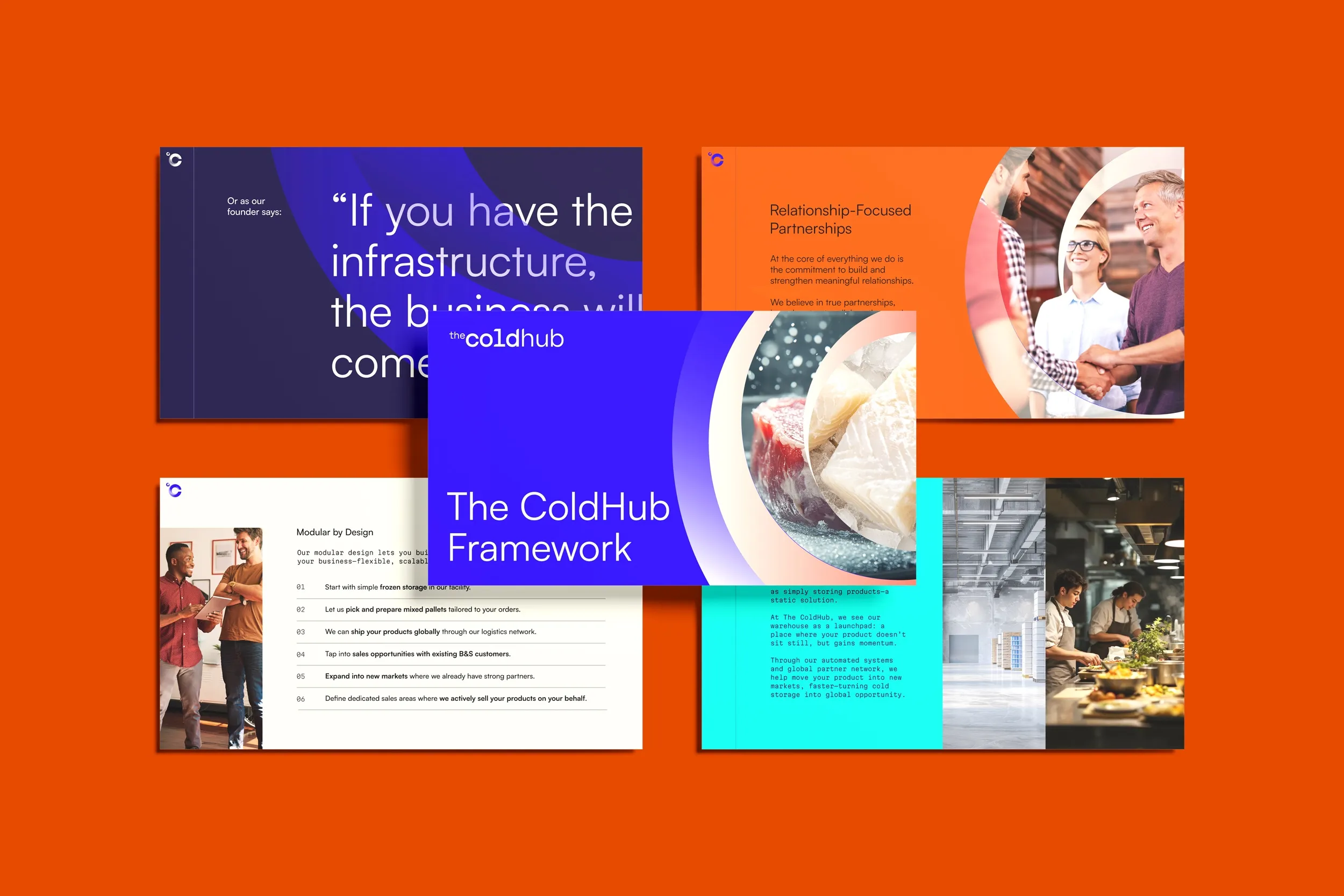For The ColdHub, we developed the brand from the ground up—crafting strategy, naming concepts, and a bold visual identity. In a category where competitors often focus on purely technical features, our approach positioned The ColdHub as more than a warehouse: a thriving hub for food brands to connect and grow. By framing the brand as a “cold community,” we elevated its presence beyond logistics, establishing it as the future leader of cold storage in Europe with a strong, distinctive voice and design system.